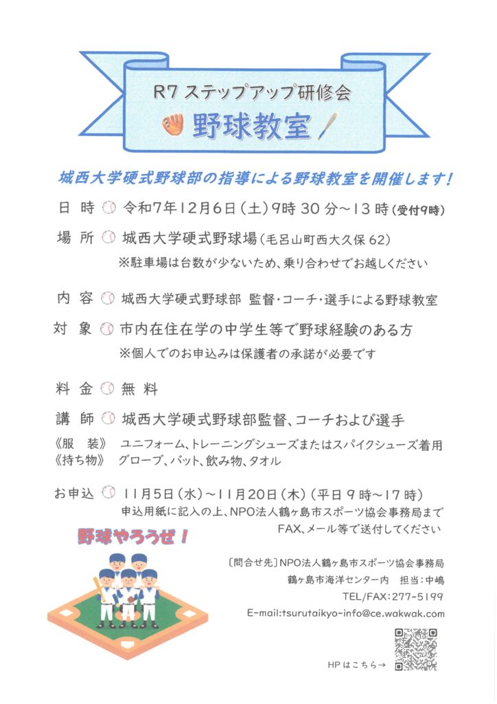※申込用紙に記入の上、NPO法人鶴ヶ島市スポーツ協会までFAX、メール等で送付してください