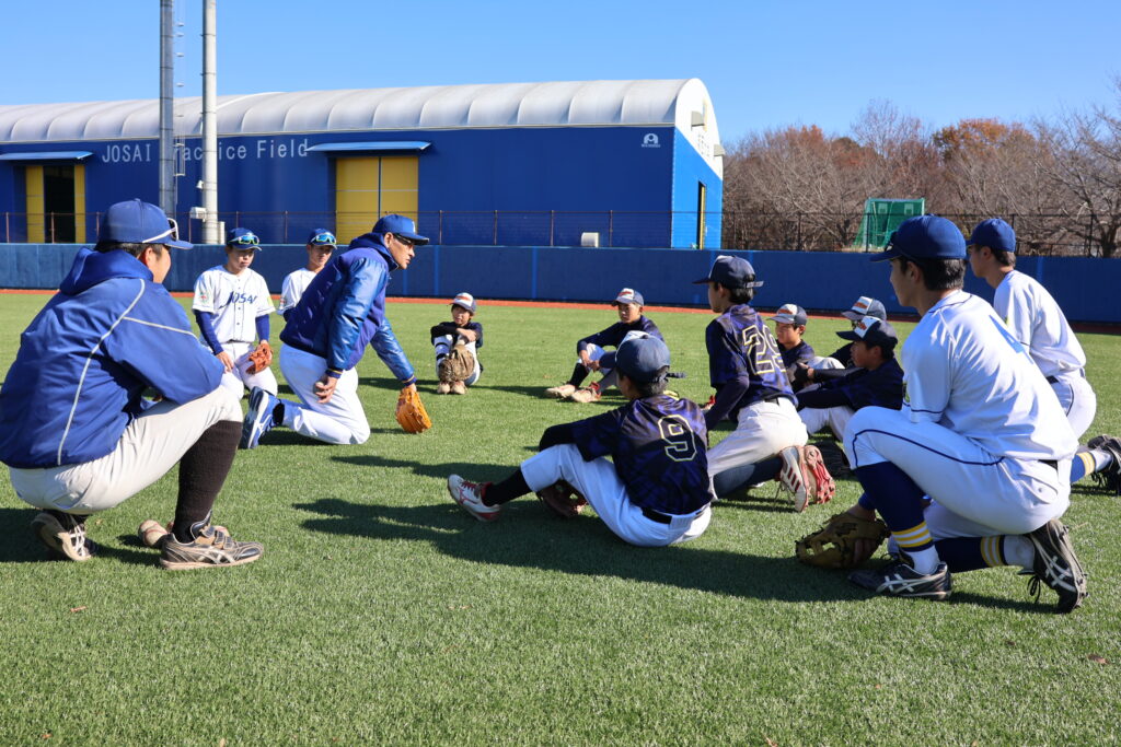 城西大学硬式野球部のコーチ、部員の皆様が直接指導にあたり、普段の練習では体験できない本格的な技術を機会となりました。